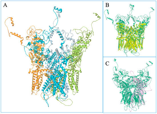 Model of the human TRPV1. (A) The ‘cartoon’ representation of the homotetrameric model of TPRV1, coloured by chain. (B) Overlap between the model of TRPV1 (green) and the template (PDB code: 7LPB) (cartoon). (C) Overlap between the chain A of the TRPV1 model (green) and the single chain of the Alpha Fold model (pink).