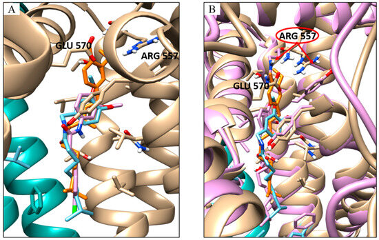 Docking results for capsaicin and inhibitor. (A) Overlay of the docking pose of the capsaicin with the best energy cluster (orange stick) with the capsaicin with the best numerousness in cluster (cyan stick) and the inhibitor (pink stick). (B) Overlay of the docking pose of the capsaicin with the best energy cluster (orange stick) with the capsaicin with the best numerousness in the cluster (cyan stick) and the capsaicin bound to the TRPV1 agonist-bound conformation (pink stick); in cyan/beige and pink cartoon TRPV1 in antagonist- and agonist-bound conformation, respectively. Pointed by the red arrows the different orientations of the Arg 557 before and after the conformational change.