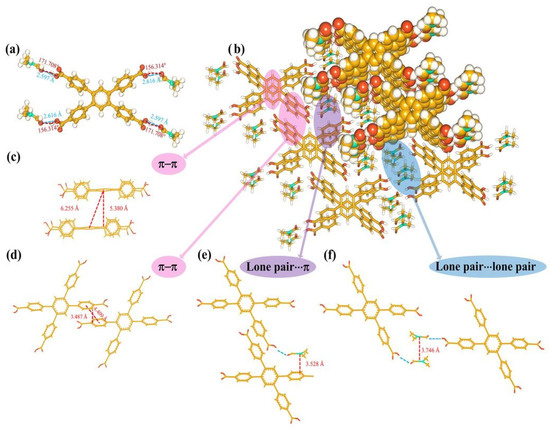 The single-crystal X-ray diffraction data of H4TCPB·4DMF have been mentioned in our previous work (HOF-TCPB-298) [28]. Here, they are described in more detail. The structure of the H4TCPB·4DMF molecule consists of five benzene rings and four carboxyl groups. One benzene ring is in the center, and four attached carboxyl phenyl groups can theoretically serve as the hydrogen bond donors. Also, in the crystal structure of H4TCPB·4DMF, each H4TCPB connected with four DMF molecules by hydrogen bonding (Figure 2a) which is considered to be a structure unit. The hydrogen-bonding distances between the two O atoms (dO−H···O) are 2.616 Å and 2.597 Å, and the corresponding angles (θO−H···O) are 156.314° and 171.708°, which confirms the substantial hydrogen bonds. Such structure units are packed through π–π interaction and hydrogen bonds. The stacking view along the (100) direction is shown in Figure 2b, where some interactions are marked. As shown in Figure 2c,d, the distance between the rings in locations where π–π stacking interactions occured was calculated. The plane distance between phenyl rings at the center of each H4TCPB molecule is 5.380 Å, and the center distance of the phenyl ring is 6.255 Å. Moreover, the diagonally positioned phenyl rings of H4TCPB are located in the same plane, and the phenyl rings are in the same position as adjacent H4TCPB linkers. The distance between the center of the corresponding phenyl rings is 4.409 Å, while the distance between planes is only 3.487 Å. Figure 2e presents the lone pair···π contact between the nitrogen atom of the DMF molecule, which was linked to H4TCPB through hydrogen bonds, and the benzene ring. The distance between the nitrogen atom and the plane of the benzene ring is 3.528 Å. Moreover, there are lone pair···lone pair contacts between the nitrogen atoms in adjacent DMF molecules and the distance between them is 3.746 Å (Figure 2f). Based on these interactions, the building units of H4TCPB·4DMF stack and grow to the long-range ordered crystal materials.