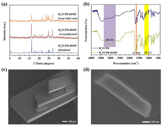 Characterizations of H4TCPB·4DMF: (a) FT−IR spectra; (b) PXRD patterns; (c) SEM image for the bulk crystals; (d) SEM image for the nanocrystal.