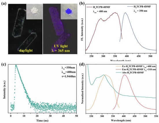 The fluorescence properties of H4TCPB·4DMF were investigated at room temperature. As shown in the optical photos of the bulk crystals and the nanocrystal sample (Figure 4a), the changes in the color of H4TCPB·4DMF under different lights are instantly visible to the naked eye. It is colorless in daylight and blue-purple in UV light (λ = 365 nm). This indicates that H4TCPB·4DMF can undergo fluorescence excitation with UV light, which should be attributed to the fact that the long range ordered arrangement in the crystal structure limits the rotation and vibration of the benzene rings, thus reducing nonradiative transition and providing better quantum yield [29]. This was further investigated using fluorescence spectral analysis. As shown in Figure 4b, the solid-state sample of H4TCPB·4DMF shows a width excitation band from 250 nm to 375 nm with a peak at 350 nm, and the emission spectra with the excitation wavelength of 350 nm peak at 400 nm. The fluorescence emission lifetime of the solid sample is τ = 1.9448 ns (Figure 4c), which exhibits the fluorescence behavior of H4TCPB·4DMF. The quantum yield is as high as 89.02% (Figure S2). Furthermore, the ultraviolet absorption, fluorescence excitation, and emission spectral analysis of the H4TCPB·4DMF aqueous suspension were performed (Figure 4d). The wavelength coverage of fluorescence excitation is consistent with that of ultraviolet absorption. The peaks of the fluorescence excitation and emission spectra are 318 nm and 400 nm, respectively.