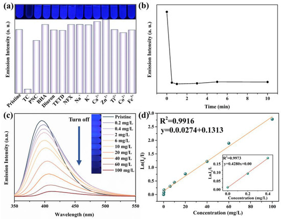 Fluorescence response performances of the H4TCPB·4DMF aqueous suspension for TC: (a) changes in the emission intensity determined by fluorescence spectra upon the addition of different substances (100 mg/L); the inset is the optical photographs under UV light, λ = 356 nm; (b) changes in emission intensity with time when TC is added, C0 = 100 mg/L; (c) fluorescence spectra with different TC concentrations; the inset is the color change observed in the optical photographs under UV light, λ = 356 nm; (d) linear relationship between Ln(I0/I) and TC concentration in the range of 0.4–100 mg/L; the inset is the linear relationship between Ln(I0/I) and TC concentration in the range of 0–0.4 mg/L.