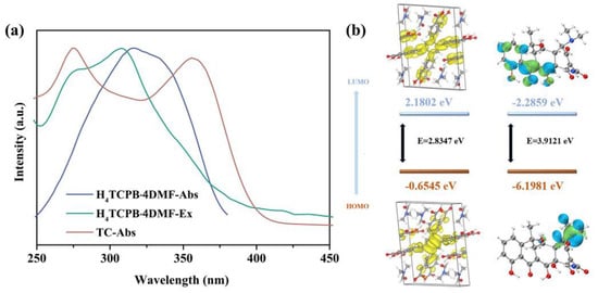 The mechanism of H4TCPB·4DMF sensing TC in aqueous solution was explored. First, the fluorescence excitation spectrum of H4TCPB·4DMF, as well as the UV–vis absorption spectra of H4TCPB·4DMF and TC, are compared in Figure 6a, and it can be seen that they partly overlap in the wavelength range of 250–400 nm. Moreover, the fluorescence spectrum of H4TCPB·4DMF and UV–vis absorption spectrum of TC are shown in Figure S5. It can be seen that there is little overlap between the fluorescence emission of H4TCPB·4DMF and the ultraviolet absorption of TC. This rules out the possibility that the fluorescence emission is absorbed, which results in fluorescence quenching. Therefore, the luminescence quenching of H4TCPB·4DMF toward TC in the aqueous solution might be attributed to PET and the competition of energy absorption [39]. PET is a process of exciting electron transfer from the photoexcited donor (H4TCPB·4DMF) to the lowest unoccupied molecular orbital (LUMO) of the acceptor (TC) [40]. Based on the confirmed crystal structure of H4TCPB·4DMF, the DFT calculation was implemented to further prove the PET mechanism. As the diagram in Figure 6b reveals, the HOMO energy levels of H4TCPB·4DMF and TC are −0.6545 eV and −6.1981 eV, respectively, while the LUMO energy level of H4TCPB·4DMF is 2.1802 eV, which is higher than that of TC (−2.2859 eV). In addition, the functional groups on TC have a strong electron-withdrawing capacity under the combined effect of conjugation and induction [41]. As a result, the luminescence quenching of H4TCPB·4DMF in the solution toward TC might be due to the PET process from H4TCPB·4DMF to TC. Moreover, the binding of DMF molecules enhances the van der Waals forces around H4TCPB, and enhances the photostability and photochemical activities during the process quenching C [42].