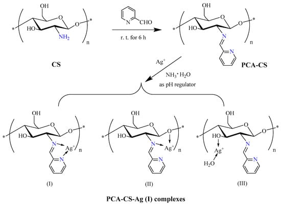 As shown in Figure 1, 2-pyridinecarboxaldehyde (PCA) was added into the CS solution and stirred at room temperature (r.t.) for 6 h to obtain the modified CS (PCA-CS) through the nucleophilic addition–elimination reaction. Subsequently, ammonia water was chosen as a pH regulator instead of a NaOH aqueous solution, which avoided the direct interaction between Ag+ and alkali to form Ag2O, and then PCA-CS coordinated with silver ions under the right conditions to yield the PCA-CS-Ag complexes.