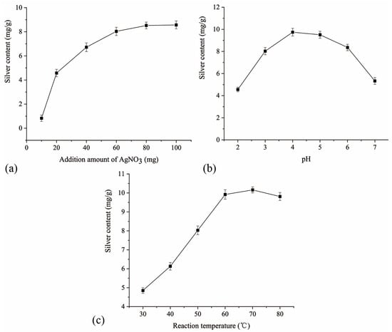 As shown in Figure 2a, the additional amount of silver nitrate had a significant effect on the silver content of the complex. With the increase of the additional amount of silver nitrate from 10 to 60 mg, the silver content in the resulting complex rapidly increased. However, further increasing the additional amount of silver nitrate from 60 to 100 mg, the silver content slowly increased and gradually stabilized. It should be supposed that the lone pair electrons provided by O and N in the ligand of modified CS entered the empty orbitals of silver ions due to the electrostatic effect, forming a complex. Consequently, the amount of coordination increased upon increasing the silver ion concentration. However, as the number of chelating sites in the polysaccharide molecules gradually decreased, the coordination amount increased slowly until the coordination saturated and entered a dynamic equilibrium []. In addition, not all of the silver ions were involved in coordination according to the mass of metal ions before and after the reaction [].