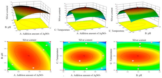 Three-dimensional response surfaces and contour plots of the dependent variable (silver content) and three independent variables (additional amount of silver nitrate, solution pH, and reaction temperature).