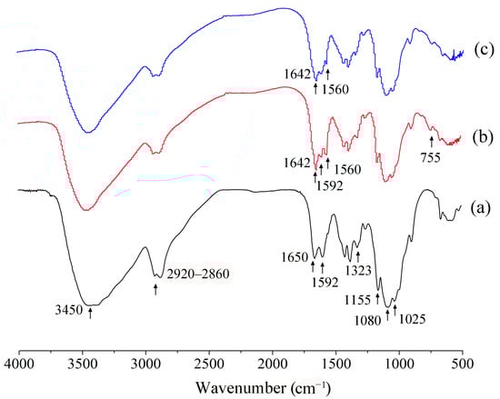 Infrared spectroscopy is a sensitive method used to analyze the molecular chemical structure of materials, which is suitable for determining macromolecules in different states, concentrations, and environments. Therefore, it is an effective tool for determining the changes in the chemical structure of polymers [,]. FT-IR spectra of CS, PCA-CS, and the PCA-CS-Ag complex are shown in Figure 5. In the FT-IR spectrum obtained for CS, the absorption peak at 3450 cm−1 was attributed to the superposition of the N-H and O-H stretching vibrations, and the absorption band at 2920–2860 cm−1 was caused by the symmetric and asymmetric stretching vibrations of C-H. The absorption peaks at 1650, 1592, and 1323 cm−1 were assigned to the stretching vibrations of the carbonyl group (C=O), the bending vibrations of the amino group (N-H), and the stretching vibrations of the carbon–nitrogen bond (C-N), respectively, corresponding to the classic Amide I, Amide II, and Amide III bands of CS []. In addition, the absorption peaks at 1155, 1080, and 1025 cm−1 were attributed to the stretching vibrations of C-O-C, secondary, and primary alcohols on the pyran ring of CS, respectively []. When compared with CS, the amino group (N-H) bending vibration peak observed at 1592 cm−1 in the spectrum of PCA-CS was weakened and new absorption peaks appeared at 1642, 1560, and 755 cm−1, which were assigned to the stretching vibrations of the imine (C=N) bonds, the stretching vibrations of the pyridine C=C bonds, and the bending vibrations of the pyridine C=C–H bonds, respectively [], indicating that PCA was successfully grafted on CS. When compared with PCA-CS, the absorption peaks at 1642 and 1560 cm−1 were weakened for the PCA-CS-Ag complex, indicating the coordination of Ag+ with the imine moieties and pyridine ring, which was in agreement with previous studies in the literature []. Meanwhile, the absorption peaks at 1080 and 1025 cm−1 did not change obviously, which suggested that only a small amount of the hydroxyl groups may be coordinated with Ag+.