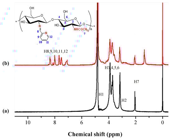 To further confirm that PCA was successfully grafted onto CS, a structural analysis was carried out using 1H NMR spectroscopy. The 1H NMR spectra obtained for CS and PCA-CS are shown in Figure 6. In the CS spectrum, the peak at 2.02 ppm was attributed to the CH3 protons in the N-acetylamino residues. The peak corresponding to the H1 proton was located near 5.00 ppm, which was covered by the solvent peak and could not be recognized. The signal peak located at 3.17 ppm suggested the presence of the H2 protons and the response signals of H3–H6 were in the range of 3.32–3.95 ppm where overlapping peaks were observed, which was consistent with those reported in the literature [,]. When compared with CS, new signals in the range of 7.0–8.5 ppm were observed in the spectrum obtained for PCA-CS. The signal at 8.08 ppm corresponded to the imine protons, while those at 8.45, 7.83, 7.67, and 7.24 ppm corresponded to the H12, H9, H10, and H11 protons on the pyridine ring residues, respectively [,]. These results further confirmed the successful grafting of PCA onto CS.