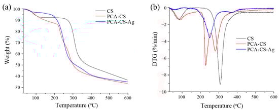 TG (a) and DTG (b) curves of CS, PCS-CS, and PCA-CS-Ag complex.