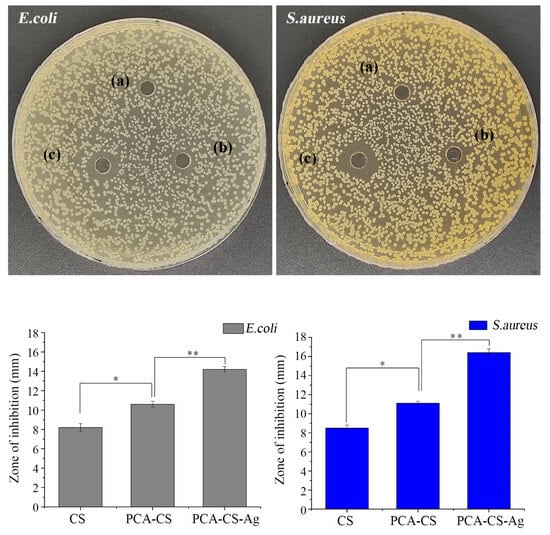 Metals, such as silver and zinc, with antimicrobial activity offer a wide spectrum of applications as additives or components for biopolymers, medicine, textiles, coatings, and interior paints. Chen et al. [] prepared the single-ion-exchange zeolite (silver zeolite, zinc zeolite) and investigated their antibacterial effects on Escherichia coli by measuring the O.D. value of the bacteria solution after contacting the antibacterial agent. It was found that the antibacterial effect of silver zeolites on E. coli with a low silver content was much better than zinc zeolites with a high zinc content, indicating silver-containing materials with better antibacterial activity compared with zinc-containing ones. Herein, the inhibition zone results obtained for the silver-containing samples are shown in Figure 9. The antibacterial effect of pure CS was not obvious, which was due to the fact that the antibacterial activity of pure CS was affected by lots of factors, such as the bacterial species, environmental factors, and its molecular structure (including biological sources, molecular weight, degree of deacetylation, structural configuration, and so on) []. The ZOI values of PCA-CS against E. coli and Staphylococcus aureus were 10.6 ± 0.3 and 11.1 ± 0.2 mm, respectively, presenting a significantly stronger antibacterial activity than those of CS (p < 0.05), which was in line with the previously reported results [,]. It could be explained that CS Schiff base with imine groups (-RC=N-) improved its permeability, hydrophilicity, and solubility, as well as enhanced its ability to carry positive charges and coordinate with metals, thereby contributing to its superior antibacterial efficacy. After the chelation of PCA-CS with Ag+, the ZOI values of PCA-CS-Ag against E. coli and S. aureus were 14.2 ± 0.3 and 16.2 ± 0.4 mm, respectively, compared to PCA-CS with significant differences (p < 0.01), indicating that the coordination with Ag+ exerted a synergistic antibacterial effect.