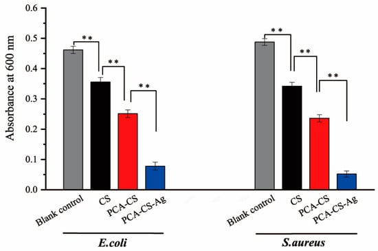 To further confirm their antibacterial activities, the samples were co-cultured with bacterial suspensions for 5 h, and the optical density (OD) value of the bacterial suspensions was measured at 600 nm to quantitatively evaluate the antibacterial effects. As shown in Figure 10, CS in the bacterial suspensions showed antibacterial effects with no more than 30% of antibacterial rates. The chemical modification and the complexation with Ag+ significantly enhanced the antibacterial effect of the polymer, which was consistent with the results of ZOI. Especially, PCA-CS-Ag showed excellent antibacterial activity against E. coli and S. aureus with antibacterial rates of 83.1% and 89.3%, respectively (Table 4).