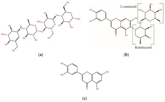 - Landeros-Martínez, L.-L.; Gutiérrez-Méndez, N.; Palomares-Báez, J.P.; Sánchez-Bojorge, N.-A.; Flores-De los Ríos, J.P.; Piñón-Castillo, H.A.; Chávez-Rojo, M.A.; Rodriguez-Valdez, L.-M. The Oxidative Process of Acarbose, Maysin, and Luteolin with Maltase-Glucoamylase: Molecular Docking and Molecular Dynamics Study. Appl. Sci. 2021, 11, 4067. [Google Scholar] [CrossRef]