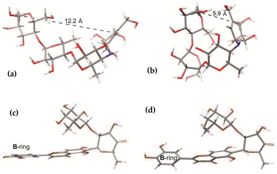 The rotational freedom degrees of MAY and ACA result in a large number of local minima. The search of the global minimum using the CREST tool located 11, 581, and 1604 conformers for LUT, MAY, and ACA, respectively. As expected, only a few LUT conformers were found due to its small size, with only the rotation of its hydroxyl groups. The global minimum conformation of ACA differs significantly between the gas phase and water solution, as shown in Figure 2a and b, respectively. This can be observed in the distance from side to side of the ACA structure, which measures 12.2 Å in water solution and 5.9 Å in the gas phase, highlighting the solvent effect on the ACA structure. The solvent effect is not significant for the MAY molecule (Figure 2c,d), where only small rotations are observed in the hydroxyl groups and the B-ring (polyphenolic moiety).