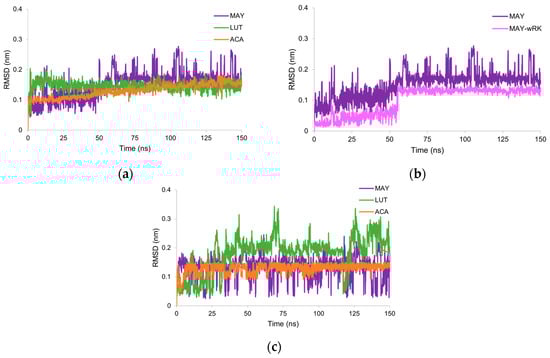 (a) RMSD values of the heavy atoms in the complexes of ACA, MAY, and LUT with NtSI domain B. (b) RMSD values of atoms of maysin (MAY) and atoms of polyphenolic moiety of maysin without rhamnosyl-6-C-(4-ketofucosyl) group (MAY-wRK). (c) RMSD values of atoms of the complexes of ACA, MAY, and LUT with CtSI domain D.