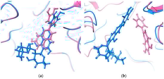 (a) Initial docking pose and (b) final pose obtained by MD run of MAY (blue) and LUT (pink) in NtSI domain B.