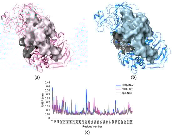 Protein surface of NtSI domain B in complex with (a) MAY and (b) LUT. (c) The RMSF of apo and ligand-bound (MAY and LUT)-NtSI domain B.