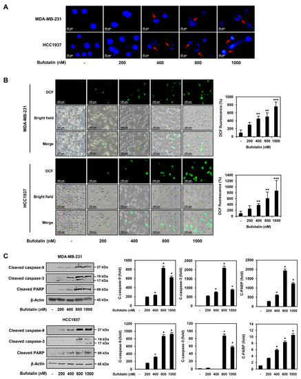 To further verify the TNBC cell apoptosis induced by bufotalin, we first investigated whether bufotalin causes nuclear morphological changes in MDA-MB-231 and HCC1937 TNBC cell lines. Staining of nuclei with 4′,6-diamidino-2-phenylindole (DAPI) showed that bufotalin treatment for 48 h induced nuclear condensation and fragmentation in both the cell lines (Figure 3A). Next, to determine whether bufotalin affects the generation of ROS, which plays a central role in inducing apoptosis, intracellular ROS levels were measured using the fluorogenic indicator dichloro-dihydro-fluorescein diacetate (DCFH-DA). Bufotalin treatment for 48 h significantly increased ROS generation in MDA-MB-231 and HCC1937 cells in a dose-dependent manner (Figure 3B). We further evaluated the effect of bufotalin on the expression of caspases, which are key mediators of apoptosis and are activated by proteolytic cleavage. Active caspase-9 triggers cleavage and activation of downstream caspase-3. Subsequently, caspase-3 promotes apoptosis by cleaving the DNA repair enzyme PARP [30]. Western blot analysis revealed that bufotalin treatment for 48 h increased the expression levels of cleaved caspase-9, caspase-3, and PARP in MDA-MB-231 and HCC1937 cells (Figure 3C). These results suggest that bufotalin induces apoptosis by activating the caspase-mediated apoptotic pathway in TNBC cells.