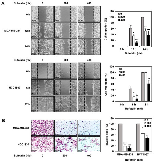 After attaching ibidi culture inserts to each well, MDA-MB-231 and HCC1937 cells were inoculated at a density of 5 × 104 cells per insert in 24-well culture plates and then incubated for 24 h. The inserts were removed, and the cells were treated with bufotalin (200, 400 nM) for 12 or 24 h. The images of migrated cells were obtained at each time point (0, 6, 12, 24 h) using the Olympus optical microscope (Tokyo, Japan) at a magnification of 200×. The area of the gap was measured, and the cell migration results were expressed as a percentage of control.