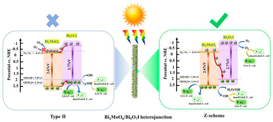 - Shi, H.; Fan, J.; Zhao, Y.; Hu, X.; Zhang, X.; Tang, Z. Visible light driven CuBi2O4/Bi2MoO6 p-n heterojunction with enhanced photocatalytic inactivation of E. coli and mechanism insight. J. Hazard. Mater. 2020, 381, 121006. [Google Scholar] [CrossRef] [PubMed]