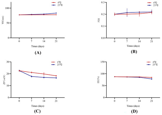 The stability of Phl-TFs at different temperatures. (n = 3, ± SD). Note: (A) VS, (B) PDI, (C) ZP, (D) EE.