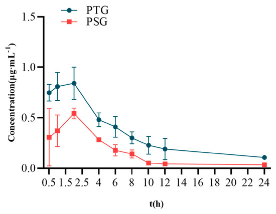 Sprague–Dawley (SD) rats were percutaneously administered 100 mg/kg PTG or 100 mg/kg PSG. The mean blood-concentration–time curves are shown in Figure 4, and the main pharmacokinetic parameters are shown in Table 2. The half-life (T1/2) of PSG was approximately 7.65 h, with a peak time of approximately 2.13 h and a mean residence time (MRT) of approximately 9.99 h. Compared with PSG administration, PTG increased the Cmax and T1/2 in rats by 0.85 μg/mL and 8.06 h, respectively. In addition, the AUC0-∞ of PTG was 8.22 μg/mL·h, which was significantly 1.97 t higher than that in the PSG group (p < 0.05, paired t test), indicating that PTG could improve the bioavailability of Phl.