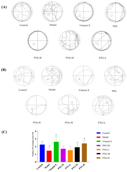 The Morris water maze test was used to evaluate the spatial memory of the rats in each group. In the directed navigation experiment, the escape latency of all groups of rats showed a gradual decrease. On the first day of training, the swimming trajectories of the rats in each group were very disorganized and irregular; by the fifth day, the escape latencies in the Vitamin E, PSG, PTG-H, and PTG-M groups were significantly shortened (Figure 5A,B). Compared with the control group, the latency period on the fifth day of the experiment was significantly higher in the model group than in the control group (p < 0.05, paired t test), indicating that modeling was successful. In addition, the latency period in the PTG-H group was similar to that of the Vitamin E group and significantly lower than that of the model group as shown in Table 3 (p < 0.05, paired t test). As shown in Figure 5C, after the platform was removed on the last day of the experiment, the numbers of platform crossings in the Vitamin E group and the high-dose PTG-H group were significantly greater than that in the model group (p < 0.05, paired t test). For the other PSG and PTG groups, although the number of platform crossings increased compared with the model group, the difference was not significant.