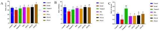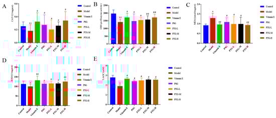 As shown in Figure 7, compared with the control group, the activities of CAT and GSH-Px were highly significantly decreased in the model group (p < 0.01, paired t test), and the activities of SOD and T-AOC were significantly decreased (p < 0.05, paired t test). Moreover, the MDA content in the model group was significantly higher than that in the control group (p < 0.05, paired t test). Compared with the model group, the vitamin E group displayed significantly increased activities of CAT, SOD, and GSH-Px in serum and a decreased MDA content. The data showed that PSG significantly increased the activities of CAT, SOD, GSH-Px, and T-AOC in the serum of rats compared with the model group (p < 0.05, paired t test). Compared with the model group, the activities of CAT, SOD, T-AOC, and GSH-Px were significantly increased in the PTG group, while the content of MDA was significantly decreased (p < 0.05, paired t test). The enzymatic activities of SOD and GSH-Px were extremely significantly increased in the high-dose group (p < 0.01, paired t test).