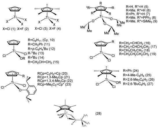 Xu et al. reported a series of indenyl titanium trifluoride complexes, Ind’TiF3 (30–38) (Figure 3). The results showed that the catalytic activity and stereoselectivity of the fluorinated complexes were explicitly higher than those of the trichloride counterparts. Moreover, the catalytic activity and stereoselectivity of the mono-indenyl titanocene trifluoride complexes were prominently higher than those of the mono-Cp’ titanocene trifluoride homolog (Table 1).