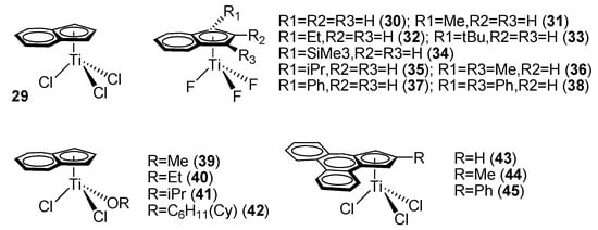 Ready et al. reported a mono-indenyl titanocene complex, IndTiCl3 (29) (Ind = η5-indenyl, Figure 3). Complex 29 exhibited considerably higher catalytic activity and syndioselectivity than the classic cyclopentadienyl titanocene trichloride complex, CpTiCl3 [53]. Under identical experimental conditions, SPS obtained from the mono-indenyl titanocene complex possessed over 90% syndiotacticity, compared with 60–80% from the simple mono-Cp’ titanocene complex.