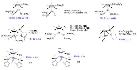 Hou et al. reported Cp’RE-R2L-type complexes (C5Me4SiMe3)RE(CH2SiMe3)2(THF) (RE = Sc, Y, Gd, Lu) (Figure 4, 46) [61]. At ambient temperature in toluene, complexes 46 did not exhibit catalytic activity toward olefins. However, when 46 were combined with one equivalent of [Ph3C][B(C6F5)4, the polymerization of styrene with high catalytic activity and syndiospecificity was achieved. As the ratio of styrene monomer to catalyst increased, the resulting SPS molecular weight increased almost linearly, and the SPS molecular weight distribution was narrow. The four reported (C5Me4SiMe3)RE(CH2SiMe3)2(THF) complexes showed highly efficient syndiospecific polymerization of styrene (rrrr > 99%), and among the four, the scandium complex (46-Sc) showed the highest catalytic activity (up to 13,618 kg mol−1h−1).