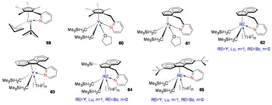 Further studying Ind-CH2-Py-RE metal complex 62 and Flu-CH2-Py-RE metal complex 63 revealed the effect of the cyclopentadiene segment structure on the activity of complexes [74]. Trimethylsilyl-substituted indenyl complex 64 (Figure 5) exhibited much less activity than complexes 62 and 63 with the Flu-CH2-Py-RE structure. Compared with the unsubstituted fluorenyl complex 63, when electron-donating tert-butyl substituents were introduced at the remote 2,7 position of the fluorene moiety, the RE metal complex 65 (Figure 5) exhibited higher catalytic activity when the active metal was an element with a small atomic radius, such as Sc, Y, and Lu.