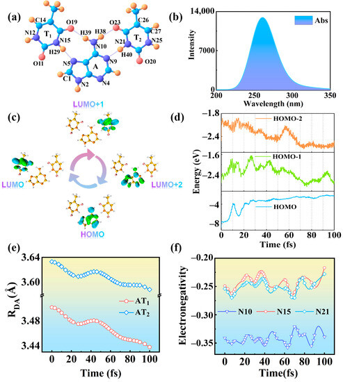 (a) Structure of TAT base triplet. Blue: C; Orange: H; Pink: O; Purple: N. (b) Absorption spectrum of TAT base triplet. (c) The molecular orbitals involved in charge transfer. Blue for holes, and green for electrons. (d) Time evolution of molecular orbitals LUMO, LUMO + 1, and LUMO + 2 involved in coherent charge transfer process. (e) The distance between the donor and acceptor varies with time. (f) The electronegativity of N10, N15, and N21 over time.