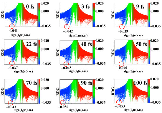 Regular changes in electronegativity will inevitably lead to change in the strength of the hydrogen bond. The evolution of the reduced density gradient (RDG) of electron density with time is an intuitive way of showing the change in hydrogen bond strength [39,40]. The hydrogen bond strengths of the TAT base triplet at different times are depicted in Figure 2 and the oscillating process of the N-H bonds near the hydrogen bond grid are observed in Figure S3. Blue represents the weak hydrogen bond interaction. Red denotes steric hindrance. The values around green represent van der Waals forces. It is observed that the hydrogen bond peak is at −0.041 at 0 fs. From 3 fs to 9 fs, the peak position of the hydrogen bond shifts from −0.042 to −0.039, and the corresponding hydrogen bond is stretched. From 22 fs to 40 fs, the system has a peak position from −0.037 to −0.045. The strengthening of the hydrogen bond corresponds to the compression of bonds such as N21-H40 and N10-H39. The hydrogen bond peak of 50 fs is again shifted to the right to −0.040. This denotes that the hydrogen bond strength decreases and the corresponding N15-H29 and N10-H38 are in a tensile state. From 70 fs to 90 fs, the hydrogen bond strength increases again, and the position of the peak corresponds to a left shift from −0.043 to −0.056. The peak position stabilized at about −0.05 at 100 fs. During 0–100 fs, the peak position of the hydrogen bond fluctuates regularly between −0.040 and −0.056. The periodic changes in hydrogen bond strength and bond length once again confirm that the charge transfer of TAT base triplets is coherent.