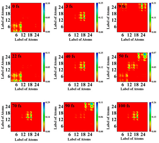 The electron–hole coherence can be accurately observed by analyzing the transition density matrix (TDM) in two-dimensional real space [41,42,43,44]. Since hydrogen does not contribute much to the overall charge transfer process, the effect of hydrogen is ignored. Figure 4 depicts the change in TDM in TAT. The abscissa is the source of electron (green). The ordinate represents the potential location of the electron during the transition (blue). At 0 fs, element (10, 1) accounts for the largest proportion, which expresses the electron transition from N10 to C1, the charge is completely populated on donor (A), and the electron–hole coherence is stronger at A. At 3 fs, the element (19, 14) accounts for the largest proportion, representing the transfer of electrons from O19 to C14, and coherent charge transfer begins to occur. This result is consistent with Figure 3. At 9 fs, the proportion of (23, 27) is the largest, showing that the electron is moving from O23 to C27, and the electron-hole coherence is stronger at T1 and T2. At 22 fs, the element converge at (10, 2), which means that the electron is back on A again, is the transition from N10 to N2. The electron transition at 40 fs is similar to that at 3 fs, focusing on the O19 and C14 of acceptor T1. The most clear is that at 50 fs, the elements have an obvious distribution on A, T1, and T2, illuminating that the charge is gradually transferred from A to T1 and T2 at this moment. The electron–hole coherence is present throughout the molecule. At 70 fs, the electron is concentrated on (19, 24) again, and the charge is transferred periodically. At 90 fs, the charge is concentrated in the T1 and T2 regions. At 100 fs, the element is again concentrated at (19, 24), ready to start a new round of periodic oscillation. During a period of 100 fs, it seems as though the electron is being transferred back and forth between the donor and the acceptor, and the electron–hole coherence varies periodically.