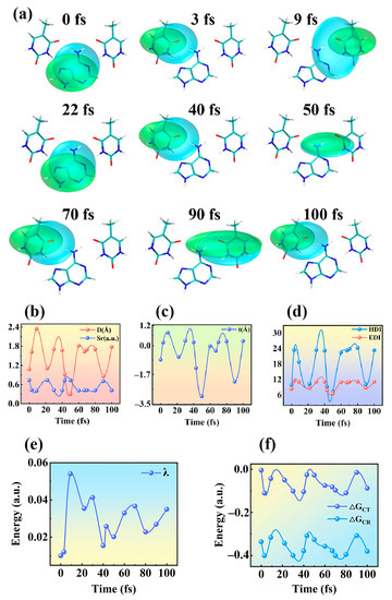 Hole–electron analysis can investigate the transition characteristics of coherent charge transfer at different times, as shown in Figure 5a. The electrons are in green, and blue is used for holes. The corresponding parameters describing the electronic excited states are listed in Figure 5b–d. Where the D index is the hole–electron distance, the overlap of the hole–electron is represented by the symbol Sr and the t index indicates the degree of hole–electron separation. The findings demonstrate that the D index approaches the Sr index at 0 fs, 22 fs, 50 fs, and 90 fs, while the t index is unmistakably negative. Moreover, both the hole delocalization index (HDI) and electron delocalization index (EDI) are much smaller. This explains why their hole distribution and electron distribution are more uniform and have obvious delocalization characteristics. All this evidence proves that TAT is in a locally excited state at these times. In this kind of excitation, the main distribution range of hole–electron is approach, the overlap degree is very high, and the hole–electron distribution is not obviously separated. On the contrary, at 3 fs, 9 fs, 40 fs, 70 fs, and 100 fs, the difference between D is large. The electron–hole center distance is far away, which expresses that TAT is undergoing charge transfer excitation at these moments. The relatively small Sr index indicates that the hole–electron overlap degree is small and the hole and electron are highly separated. The t index is positive, indicating that hole–electron separation is obvious at this time. A high separation degree can effectively strengthen electron excitation and promote the occurrence of coherent electron transfer in TAT. The corresponding HDI values and EDI values are relatively large, and the degree of delocalization of the holes and electrons is low. This implies that these moments include charge transfer excitation. It is clear that coherent electron transfer depends, critically, on the local excited states and charge transfer states of TAT, which change frequently throughout time.