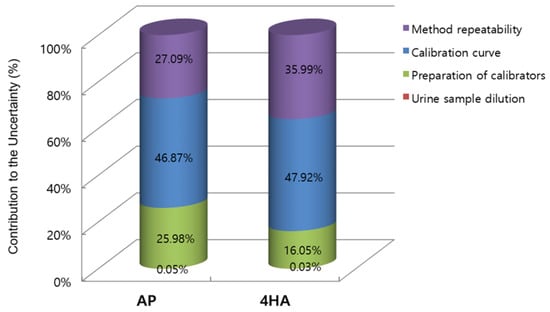An estimation of the MU associated with the analytical results can be obtained by considering different individual uncertainties. The main uncertainty sources associated with quantifying AP and 4HA in urine were urine sample dilution, preparation of calibrators, calibration curve, and method repeatability.