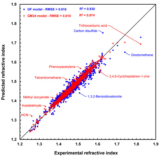 Lastly, RI prediction results with graph machines and the GF model for the 1366 molecules in the CRC set are compared in Figure 4, which is the scatter plot of the results (predicted values versus measured values). Figure 4 shows that the graph machines lead to a more accurate prediction than the GF model, as the blue points further from the bisector of the graph than the red ones. It should be noted, however, that both models poorly predict the refractive index of trithiocarbonic acid (deviation 0.129 with GM24). Its refractive index has been measured by G. Gattow [36] and is found in several monographs since then [37,38]. No other refractive index value could be found in the literature for this acid. We did, however, retrieve many experimental refractive indices of various trithiocarbonates [39], which prompted us to test our model with a couple of these compounds. For example, prediction of the refractive indices of dimethyl trithiocarbonate and ethyl phenyl trithiocarbonate with the GM24 model leads to values equal to 1.631 and 1.636, respectively, which are not so far off the experimental values of 1.676 and 1.679, respectively. One possible explanation for the significant prediction error still observed for these two molecules (deviations of 0.045 and 0.043) is that no carbon atoms linked to three sulfur atoms are present in any of the molecules in the training set. In any case, it is more than likely that the value reported for trithiocarbonic acid is uncertain and should not be retained for a future model.