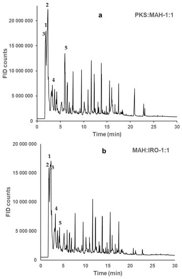 Chromatogram (GC-FID) after co-pyrolysis of two biomass blends at 600 °C and 5 s. The five main components of PKS:MAH-1:1 (a) are as follows: (1) hydroxyacetaldehyde, (2) acetic acid, (3) acetaldehyde, (4) 1-hydroxy-2-propanone, and (5) phenol, while those of MAH:IRO-1:1 (b) are as follows: (1) hydroxyacetaldehyde, (2) acetaldehyde, (3) acetic acid, (4) 1-hydroxy-2-propanone, and (5) 2,3-pentanedione. NB: (a) represents GC-FID chromatogram for PKS:MAH-1:1 and PKS:IRO-1:1, as both blends showed similar primary-product distributions.