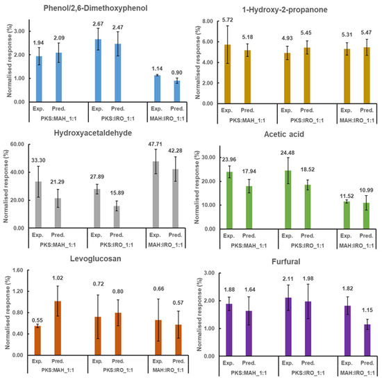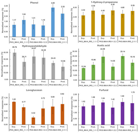 Similar to the two biomass blends, the main chemical compounds formed for each class of the three-biomass blend were as follows: phenol (phenols), 1-hydroxy-2-propanone (ketones), HAA (aldehyde), AA (acids), levoglucosan (saccharides), and furfural (furans) (see Figure 4 and Table S1). A comparison of the experimental and predicted values for the main chemical compounds indicates that the relative contents of HAA and levoglucosan were promoted by 34 and 24%, while AA was slightly inhibited for the PKS:MAH:IRO_1:1:1 pyrolysis blend. However, the relative content of AA was promoted for the PKS:MAH:IRO-1:2:2 and PKS:MAH:IRO-2:1:1 pyrolysis blends. It can be observed in Figure 4 that the relative yield of levoglucosan was inhibited when the proportion of the woody biomass was increased in the biomass blend for the co-pyrolysed feedstock (PKS:MAH:IRO-1:2:2). No difference was observed in the relative yield for 1-hydroxy-2-propanone and furfural for any of the three biomass blends, nor for phenol for the PKS:MAH:IRO_1:1:1 and PKS:MAH:IRO-2:1:1 blends. These results show that the composition and blending ratio of the biomasses influence the primary-product distribution when different types of native biomasses are co-pyrolysed.