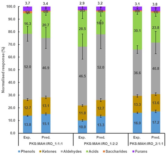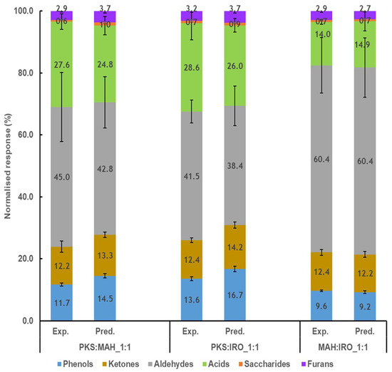 Considering the total yields of the volatile compounds formed (count/µg sample) from the pyrolysis of the biomass blends PKS:MAH-1:1, PKS:IRO-1:1, and MAH:IRO-1:1, it can be seen that the experimental values were about two times higher than the predicted values (Table S2). The yield (count/µg sample) increased from 4.48 × 104 (predicted value) to 7.53 × 104 (experimental value) for PKS:MAH-1:1, from 3.57 × 104 (predicted value) to 7.36 × 104 (experimental value) for PKS:IRO 1:1, and, finally, from 3.60 × 104 (predicted value) to 6.59 × 104 (experimental value) for MAH:IRO 1:1. This shows that co-pyrolysis could lead to an increase in the amount of volatile compounds formed.