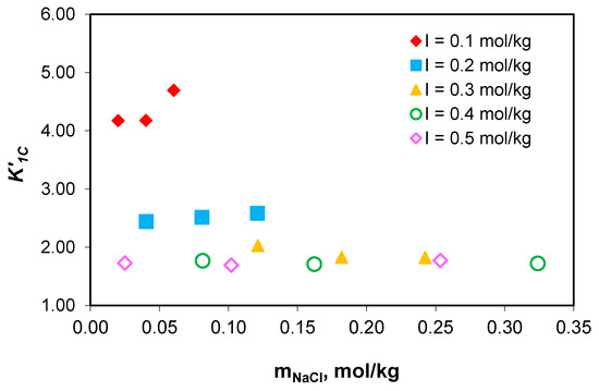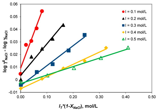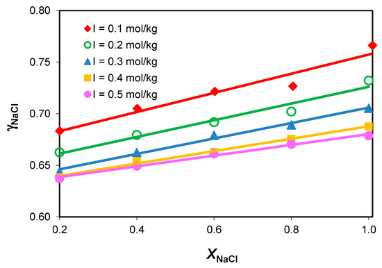 The influence of the medium composition on the sodium chloride activity coefficients, , in the NaCl-NaHCO3-H2O ternary system at constant total ionic strength and different compositions is presented in Figure 3.