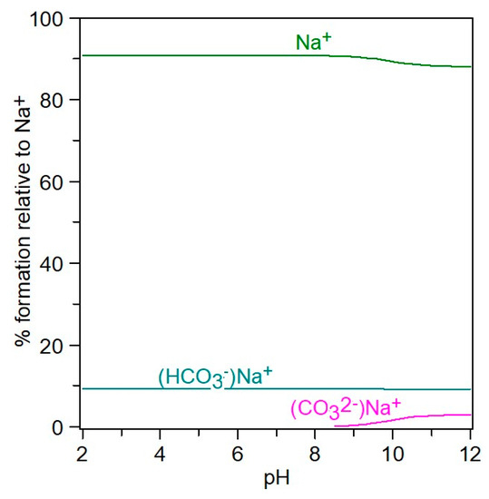 Chemical speciation can be visualized with the aid of Hyperquad simulation and speciation (HySS2009) [11,12], a utility program for the investigation of equilibria involving soluble and partially soluble species, available in electronic format at http://www.hyperquad.co.uk/hyss.htm (accessed on 20 September 2023). HySS, a computer program compatible with the Windows operating system, allows both the simulation of titration curves and the obtaining of speciation diagrams. Input data for speciation are the reactants’ total concentrations and association constants. The distribution of free ions and ion pairs present in the NaCl-NaHCO3-H2O ternary system, at different pH values, is presented in Figure 8 and Figure 9.