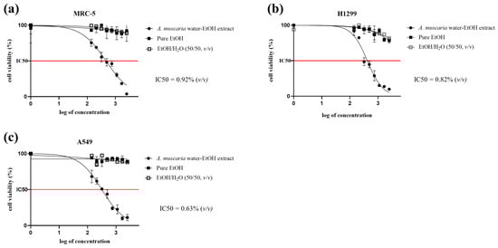 Graphs of the observed decline in cell viability after treatment with increasing concentrations of native A. muscaria water–ethanol extract and EtOH or EtOH/H2O. (a) MRC-5 healthy lung fibroblasts, (b) H1299 non-small cell lung carcinoma, (c) A549 epithelial lung carcinoma. The volume-to-volume percentage concentrations of extract, pure EtOH, or EtOH/H2O added to the cell media are plotted on the X-axes in log format. Each data point represents the mean value of four repeats, and each graph represents three independent experiments.