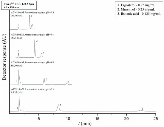 Chromatograms of separation of standards of ergosterol, muscimol, and ibotenic acid evaluated in a TorusTM Diol 130Å 5 μm 4.6 × 150 mm column with a mobile phase consisting of varying isocratic v/v ratios of acetonitrile and a 10 mM ammonium acetate solution with a pH of 6.8 at a flow rate of 1 mL/min. The injection volume of the mixture was 20 µL; the column temperature was 25 °C and the sample chamber was maintained at 20 °C. UV detection was performed at 255 nm.
