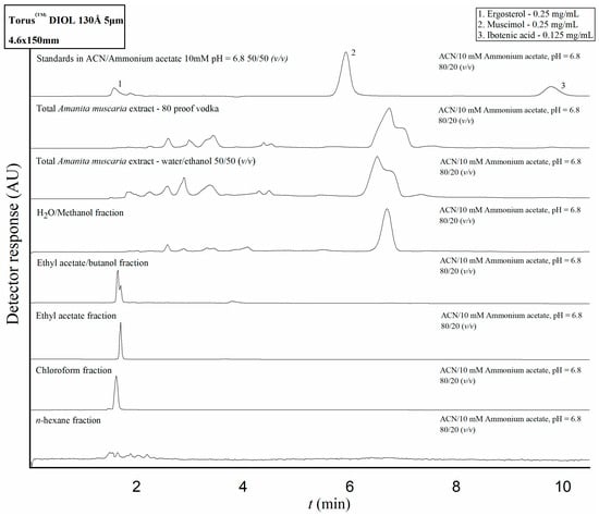 The parameters of mobile phase composition and ammonium acetate pH level were optimized with regard to analyte separation prior to analysis of the IBO, MUS, and ERG content of the extracts and fractions. The retention times of the pure compounds in solution were tested on their own, followed by evaluation of the separation from each other of pure IBO, MUS, and ERG in a mixture. We started by evaluating IBO and MUS’ retention and separation using reversed-phase and mixed-mode chromatography; however, these conditions did not provide satisfactory results because the compounds could not be precisely resolved from the dead time marker. Next, IBO and MUS’ retention and separation were tested on a TorusTM Diol 130Å 5 μm 4.6 × 150 mm column (Waters Corporation, Milford, MA, USA) with a mobile phase consisting of pure acetonitrile and a 10 mM ammonium acetate solution with a pH of 6.8 at varying v/v ratios. The flow rate was set at 1 mL/min. The injection volumes of the analyte solutions and dead time marker solutions were 5 µL and 20 µL, respectively. In the HILIC conditions, IBO, MUS and the dead time marker were sufficiently resolved from each other. The ERG stock solution retention time was also tested on this column; the analyte showed a tendency to elute almost concurrently with the dead time marker, which was not affected by decreasing the polarity of the mobile phase. Finally, a mixture of the three analytes was prepared by mixing 100 µL of the ERG stock solution with 50 µL of the IBO and MUS stock solutions, respectively, for a final concentration of 0.25 mg/mL for ERG and IBO and 0.125 mg/mL for MUS. The chromatograms of separation of standards with varying mobile phase compositions are shown in Figure 2. Upon comparison of the differences in retention times with varying mobile phase composition ratios, a ratio of 80/20 (v/v) acetonitrile to ammonium acetate was chosen as the mobile phase composition for the analyses of ibotenic acid and muscimol content in the A. muscaria extracts and fractions on the basis of optimal peak resolution and overall technical time that would be needed for performing the analysis. Under these conditions, ergosterol eluted at 1.59 min, muscimol at 5.92 min and ibotenic acid at 9.77 min. UV detection was performed at a wavelength of 255 nm.