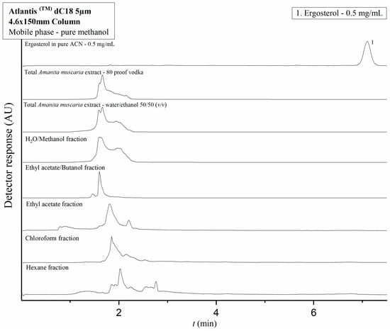 Chromatograms showing the peak of pure ERG and the total extracts and fractions on an AtlantisTM dC18 5 μm 4.6 × 150 mm column with a mobile phase consisting of pure methanol. No peaks concurrent with ERG’s established retention time are observed over the course of analysis for both extracts and all tested fractions.