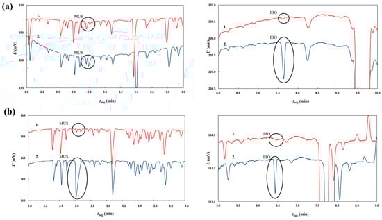 Electropherograms of analyses of the A. muscaria extract made with rye vodka (row (a); left panel – peaks for MUS, right panel – peaks for IBO) and a 50/50 water–dH2O mixture (row (b); left panel – peaks for MUS, right panel – peaks for IBO) as solvent. For each panel, 1. (upper signal) represents the sample of the respective extract diluted with dH2O (1:1, v/v) and 2. (lower signal) represents the sample of the respective extract diluted with a pure ibotenic acid (0.5 mg/mL) and muscimol (0.35 mg/mL) solution (1:1, v/v).