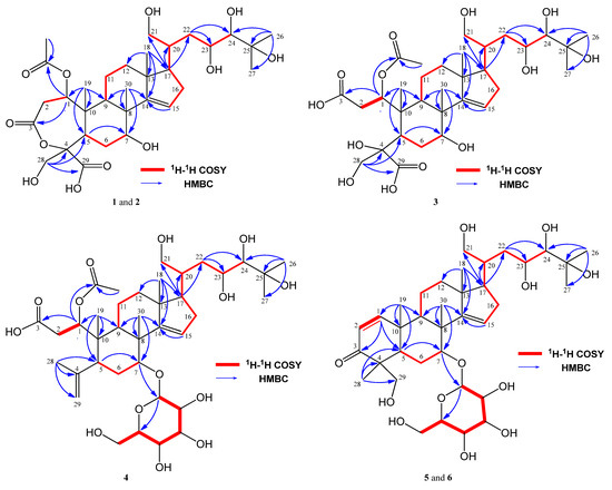 The tetracyclic ring moiety includes an α,β-unsaturated-ε-caprolactone ring (C-1–C-5, C-10) with a formyl group and a methoxy group at C-4, as well as three methyl groups at C-8, C-10, and C-13. The 1H-1H COSY cross-peaks were observed among H-1/H2-2, H-5/H2-6/H-7, H-9-H2-11/H2-12, and H-15/H2-16/H-17. Additionally, HMBC correlations were found between H-1 and C-3; H2-28 and C-4, C-5, and C-29; H3-30 and C-7, C-8, C-9, and C-14; H3-19 and C-1, C-5, C-9, and C-10; H3-18 and C-12, C-13, C-14, and C-17; and H-15 and C-14 (Figure 2). From the IR spectrum and the degree of unsaturation of compound 1, it was determined that an α,β-unsaturated-ε-caprolactone ring is present. Furthermore, the presence of an acetoxy group at C-11 was elucidated by the heteronuclear multiple bond correlation (HMBC) between H-1 and the acetoxy carbonyl carbon. The presence of a 1,4,5,6-tetrahydroxy-6-methyl-heptanol moiety at C-17 was suggested based on the 1H-1H COSY cross-peaks of H-17/H-20 and H2-21/H-20/H2-22/H-23/H-24, as well as the HMBC correlations between H3-26 and C-24, C-25, and C-26, and H-21 with C-20 and C-22. In short, the planar structure of 1 was established as described.