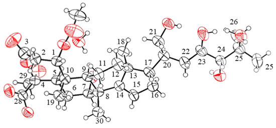 The confirmation was obtained through the utilization of single-crystal X-ray diffraction (Figure 5). Accordingly, the relative configuration of compound 2 was assigned as 1S*, 4S*, 5R*, 7R*, 8R*, 9R*, 10R*,13S*, 17S*, 20S*, 23R*, and 24R* based on the comparison of 1D NMR data (Table 1) and the 3JH,H and 2,3JC,H values of compound 2 with those of compound 1. This determination was further supported by ROESY correlations, such as H-9/H3-18 and H3-18/H-17, in compound 2 (Figure 3). The absolute configurations of compound 2 were assigned using the electronic circular dichroism (ECD) spectrum since obtaining a crystal for single-crystal X-ray diffraction data was not possible. The TDDFT {CAM-B3LYP/6-31G + (d)} calculation of a possible enantiomer (1S*, 4S*, 5R*, 7R*, 8R*, 9R*, 10R*,13S*, 17S*, 20S*, 23R*, 24R*) of compound 2 yielded a calculated ECD spectrum that matched the experimental spectrum of compound 2 (Figure 6), confirming the 1S*, 4S*, 5R*, 7R*, 8R*, 9R*, 10R*,13S*, 17S*, 20S*, 23R*, and 24R* configurations of compound 2. Thus, the chemical structures of compounds 1 and 2 were established as shown in Figure 1.