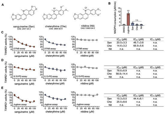 Chelerythrine inhibits the recombinantly purified rat TXNRD1. (A) Chemical structures of sanguinarine (San), chelerythrine (Che), and nitidine (Nit). (B) Reduction of indicated compounds by TXNRD1. The reaction mixture contained 30 nM TXNRD1, 200 μM NADPH, and 30 μM compounds. (C–E) Dose-response inhibition of TXNRD1 by chelerythrine and sanguinarine. TXNRD1 was incubated with the indicated compounds for 1 h at room temperature. Then, the activity of TXNRD1 was measured by three classical assays. The IC50 values, together with the IC25 and IC75 values, are shown as mean ± SEM in the table panel on the right. The values of IC25/50/75 were estimated from the dose-response curves by nonlinear curve fitting using Prism 8. n.a. means not applicable, and n.s. represents not significant, ***, p < 0.001.